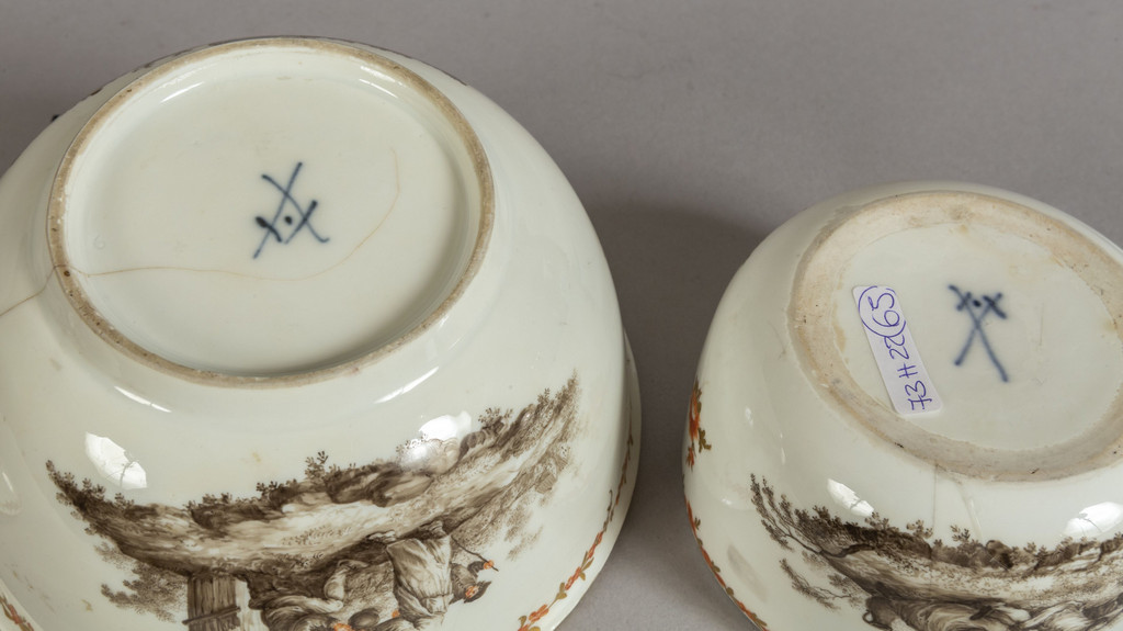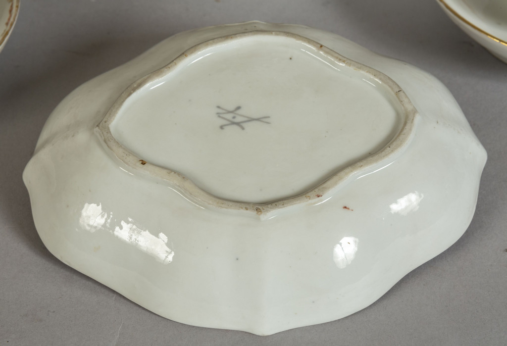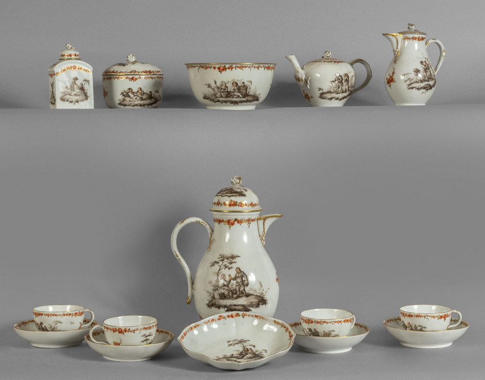 Servizio da thè incompleto in porcellana di Meissen composto da: caffettiera theiera zuccheriera lattiera scatola portathè ciotola vassoietto e 4 tazze con piattino fine sec.XVIII