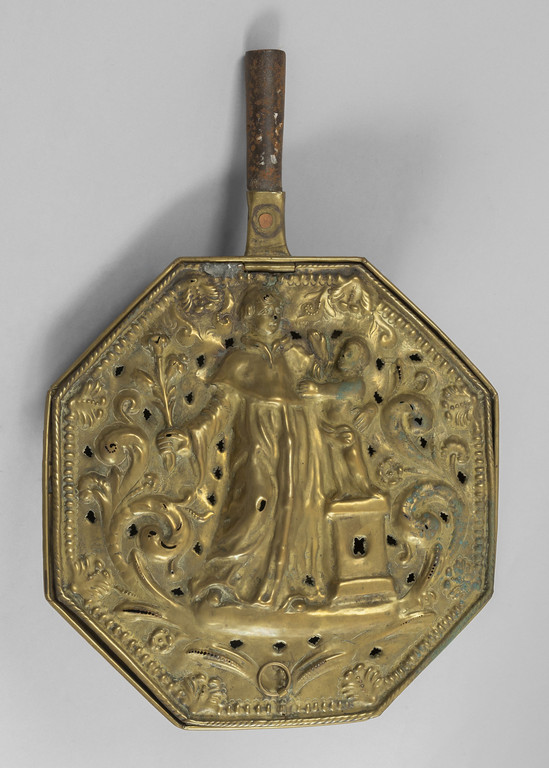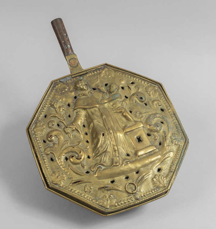 Scaldino in ottone dorato coperchio scolpito con due figure sec.XVIII