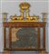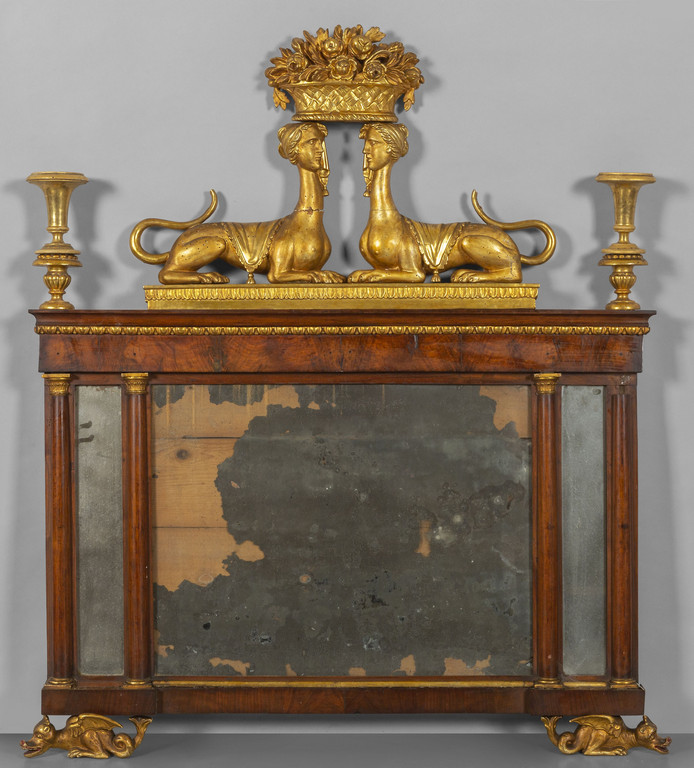 Caminiera Impero in mogano con decorazioni in legno dorato parte superiore con sfingi che sorreggono un vaso piedi a forma di draghi Toscana inizi sec.XIX