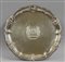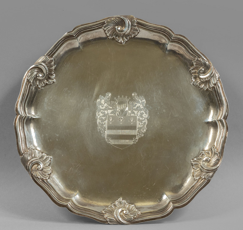 Piatto in argento decorato con pellacce ripetute sul bordo e stemma nobiliare al centro punzone della Torretta anno 1764 Genova sec.XVIII (ex collezione Rossi Torino)