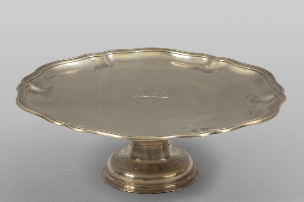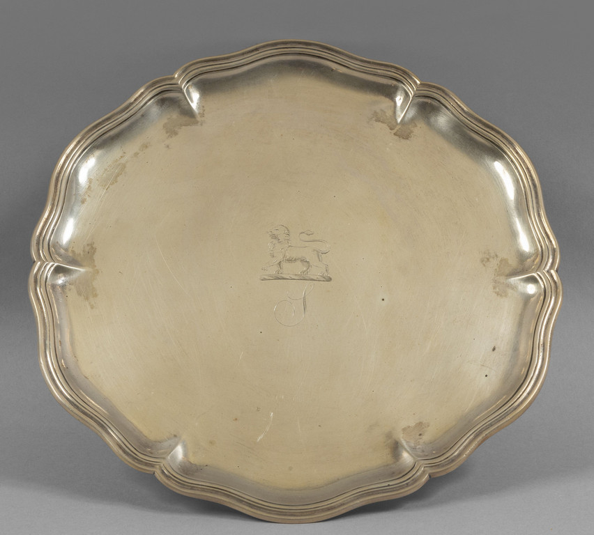 Alzata in argento bordi movimentati con al centro un leone sbalzato punzone della Torretta anno 1772 ripetuto anche sul piede Genova sec.XVIII