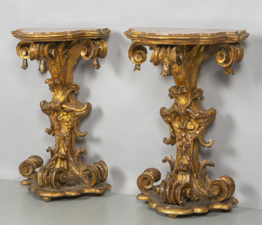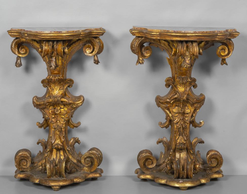 Coppia di consoles in legno intagliato e dorato a mecca pianetti in marmo Roma sec.XVIII