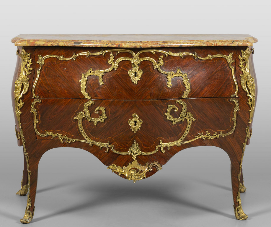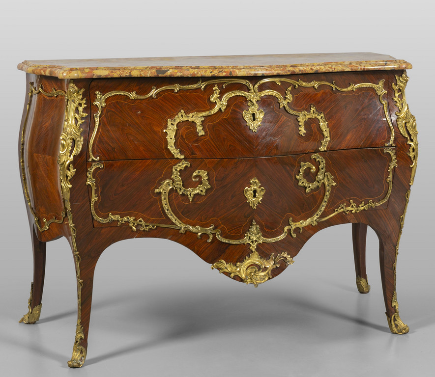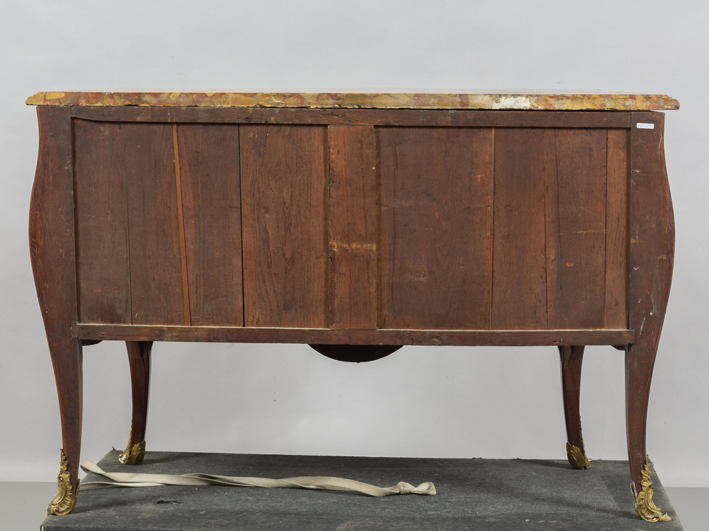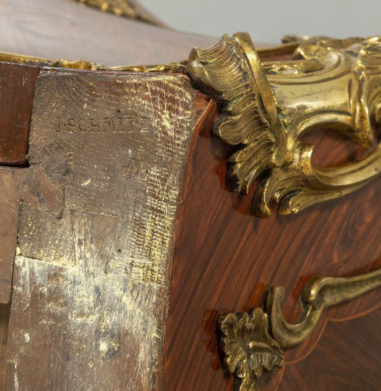 Comò Luigi XV lastronato in legno di viola movimentato sul fronte e sui fianchi due cassetti senza traverse ricca decorazione in bronzo dorato stampigliato Joseph Schmitz piano in breccia Francia sec.XVIII
