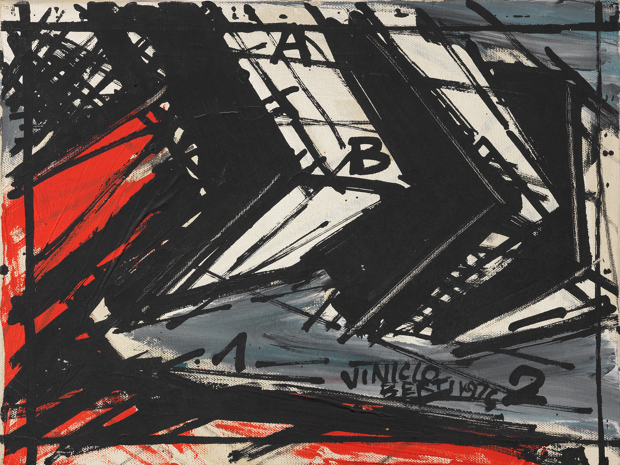 Firma e data in basso a destra: Vinicio / Berti / 1975; firma, titolo e data al verso sulla tela: Vinicio Berti / "Oggetto / costruttivo / continuo / positivo" / 1975.