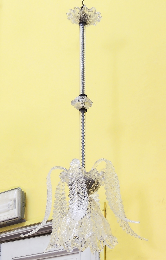 LAMPADARIO IN VETRO SOFFIATO INCOLORE Murano, Anni Quaranta realizzato come un fiore con raggiera di foglie h cm 95