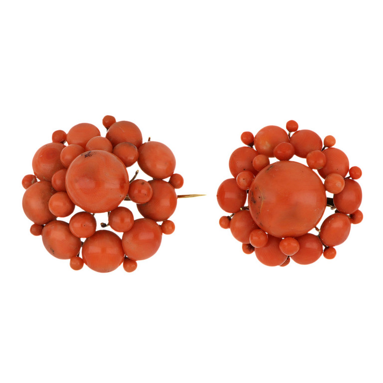 Coppia di spille di vecchia fattura punzoni francesi in corallo a 'Boulle' composte da diverse sfere a formare due rosoni.