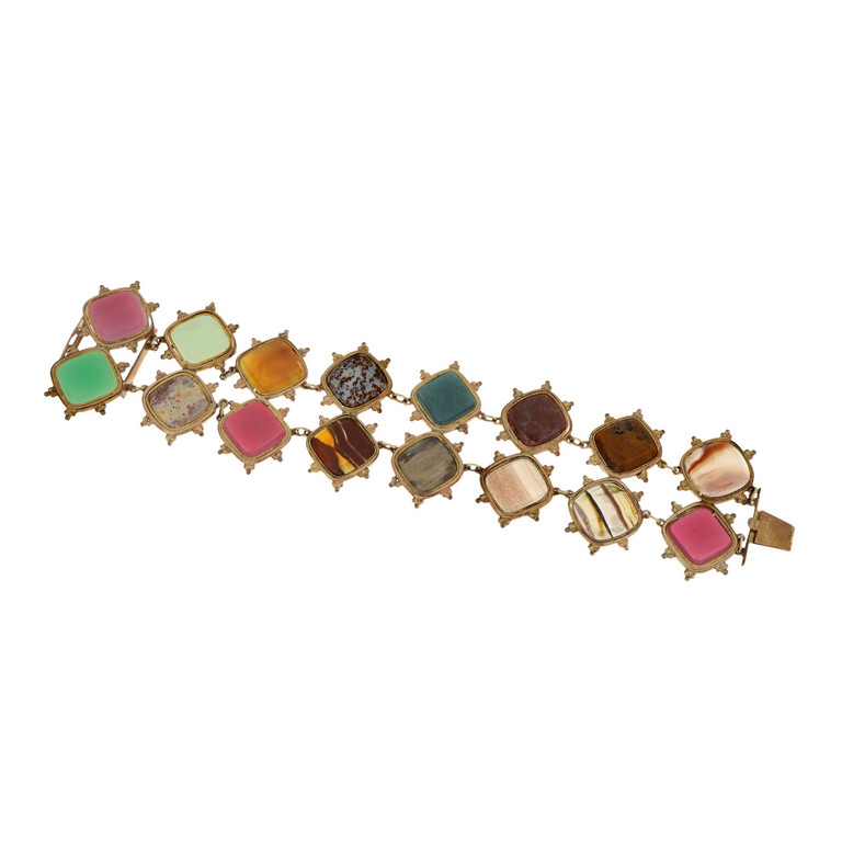 Bracciale in oro rosa basso 14k a settori romboidali ognuno adornato da pietre dure policrome tagliate a cabochon.