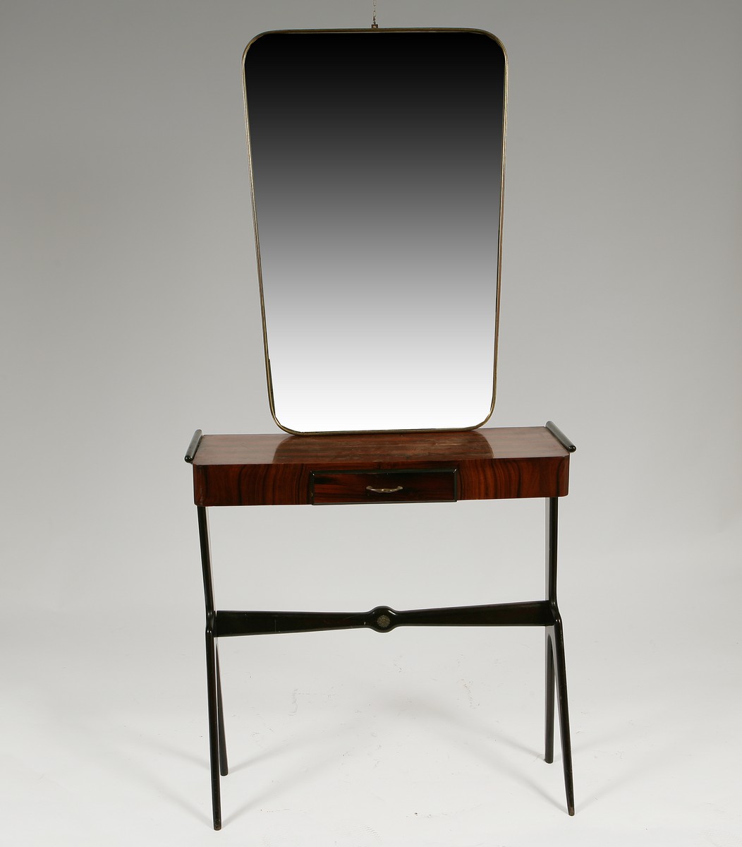 PRODUZIONE ITALIANA - ITALIAN WORK. Consolle portatelefono in legno tinto con specchiera degli anni 50. Telephone consolle of stained wood with mirror, 1950. Legno e specchio. Cm 83x88x27.