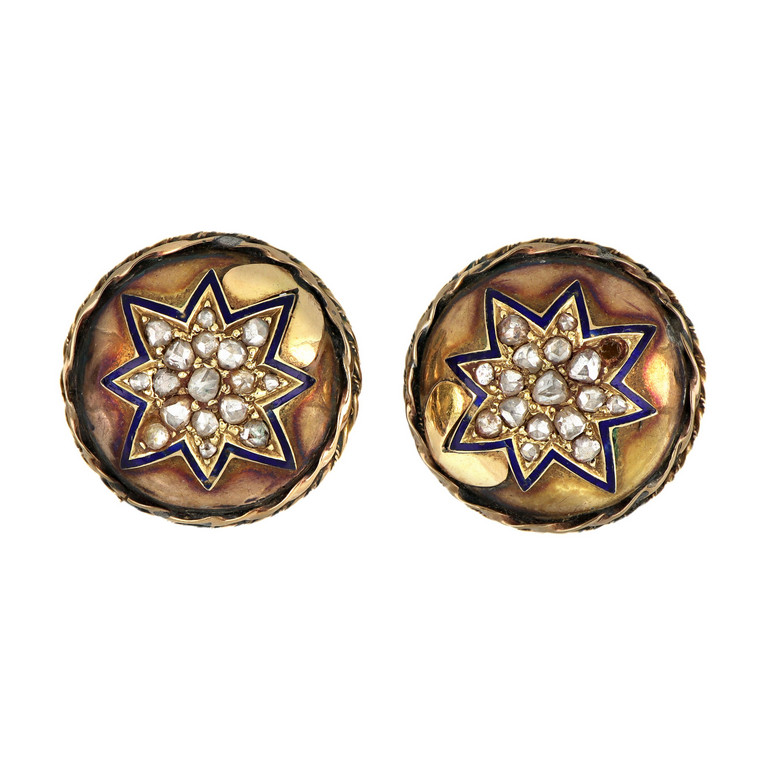 Orecchini a forma di bottone con al centro stelle in oro giallo a basso titolo diamanti taglio rosa e smalti blu.