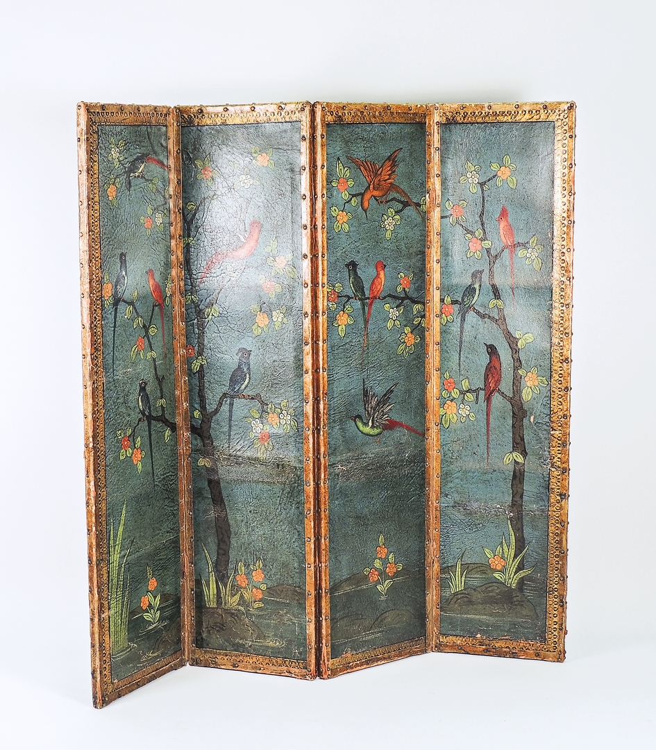 PARAVENTO A QUATTRO ANTE IN CUOIO IMPRESSO inzio del XX secolo dipinto con ram fioriti e pappagalli variopinti, lievi difetti cm 145x137