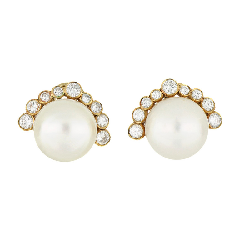 Orecchini in oro giallo a 'Clips' con al centro grandi perle coltivate australiane di 15 5 mm di diametro diamanti a contorno per meta' perimetro taglio brillante per stimati ct.1 35 ca.