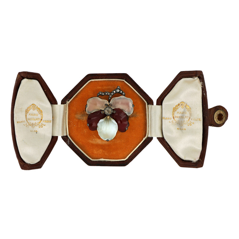 Mario Bucellati delicata spilla in quarzi policromi e diamanti taglio antico e a rosa il centrale di colore fancy realizzata in oro ossidato nero a foggia di fiore.