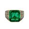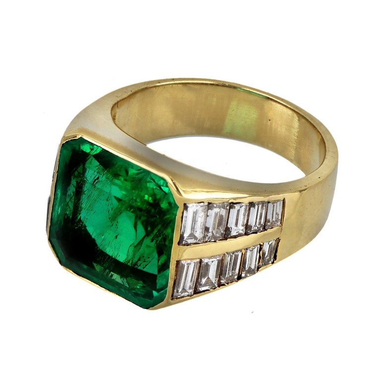 Anello a fascia quadrata in oro giallo con smeraldo colombiano taglio quadrato di ct stimati 7 00 ca. e diamanti taglio baguette su due file a impreziosire il gambo.