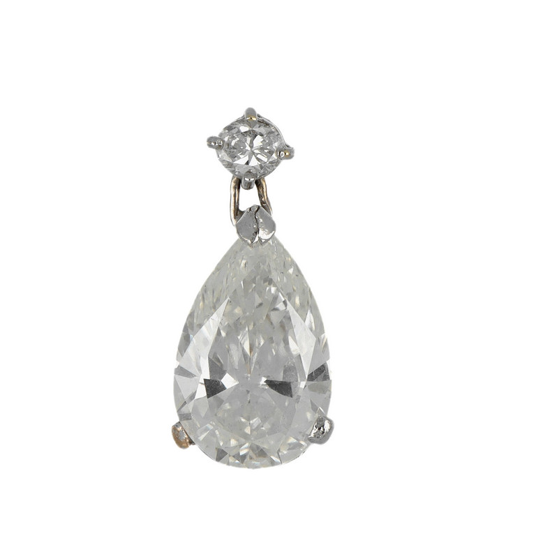 Diamante taglio goccia di ct. 4 08 colore F purezza SI2 accompagnato da report IGI Anversa n.492146383 montato in oro bianco a ciondolo con piccolo diamante taglio ovale a sentinella.