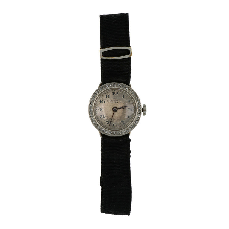 Haas Neveux orologio da donna in oro giallo e platino cinturino in seta nera piccoli diamanti sulla lunetta.