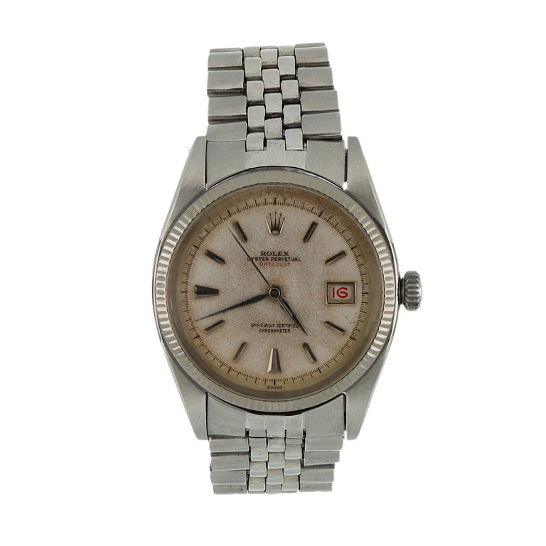 Rolex raro modello 'Ovettone' ref.6305 seriale 87725 in acciaio con bracciale jubilee messicano in splendide condizioni di conservazione revisionato e funzionante quadrante su due livelli scritta rossa datejust datario alternato rosso e nero sfere originali e fascinoso invecchiamento del quadrante panna opaco.