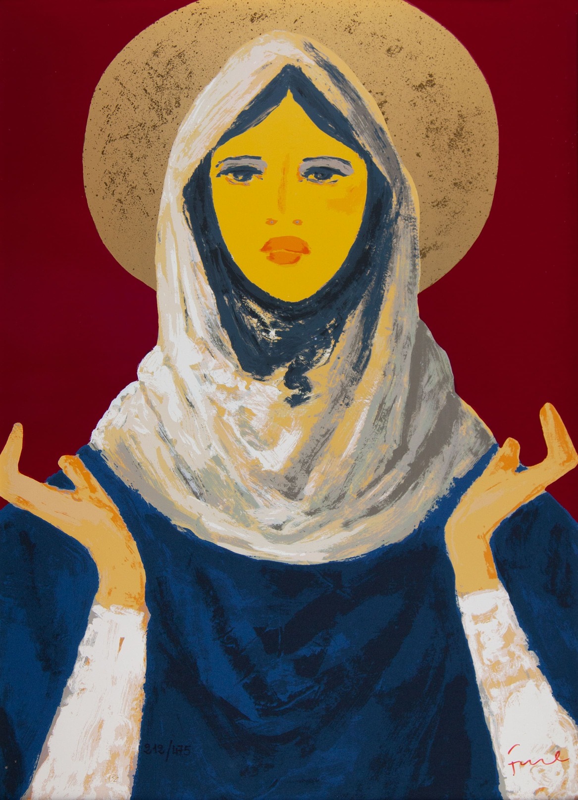 serigrafia originale in 20 colori opachi coprenti e trasparenti su fondo acciaio trattato a specchio ricoperto in oro fino a 24 carati con applicazione di polvere di velluto blu e nero a 'floccage' sulla veste.