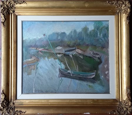Bertucci Giacomo (1903-1982) - Paesaggio con barche - olio su tela cm.50x60 firmato in basso a sinistra