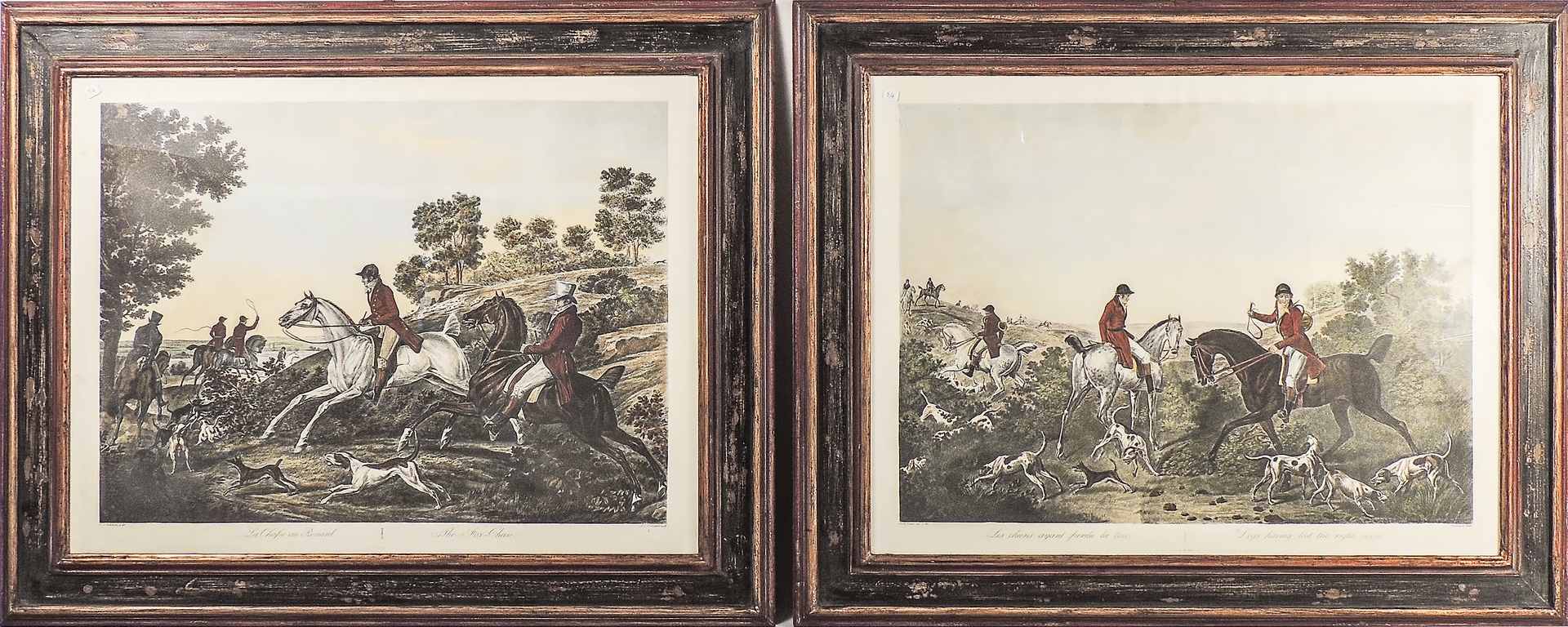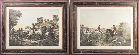 SCENE DI CACCIA ALLA VOLPE coppia di litografie colorate, in cornice cm 52x72