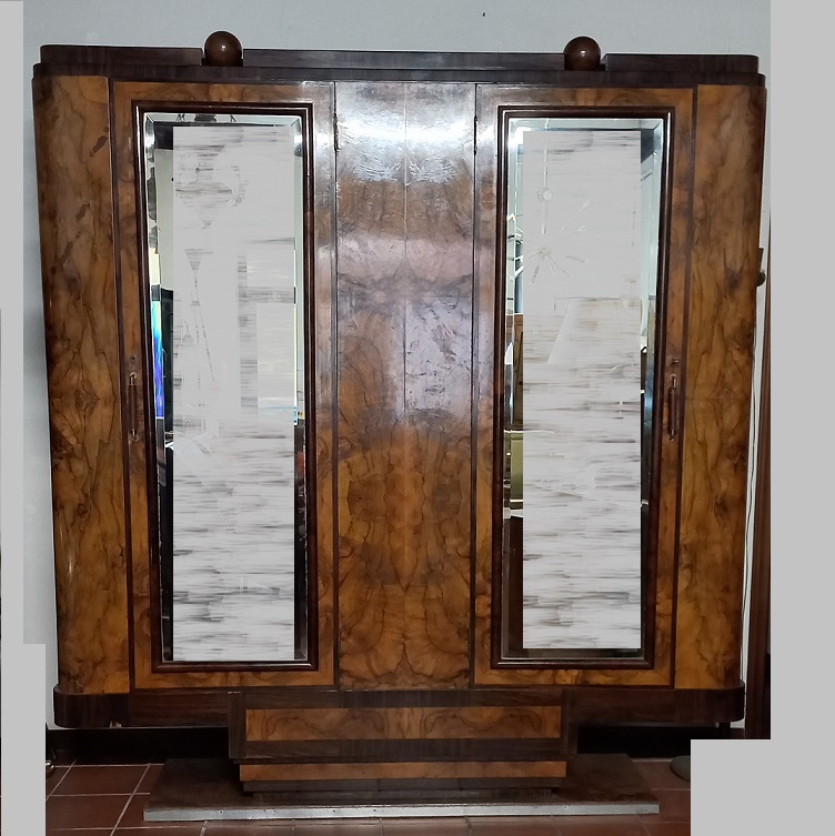 Armadio decò in legno impiallacciato in radica con base profilata in metallo e due ante a specchio molato cm.195x50 h.cm.212