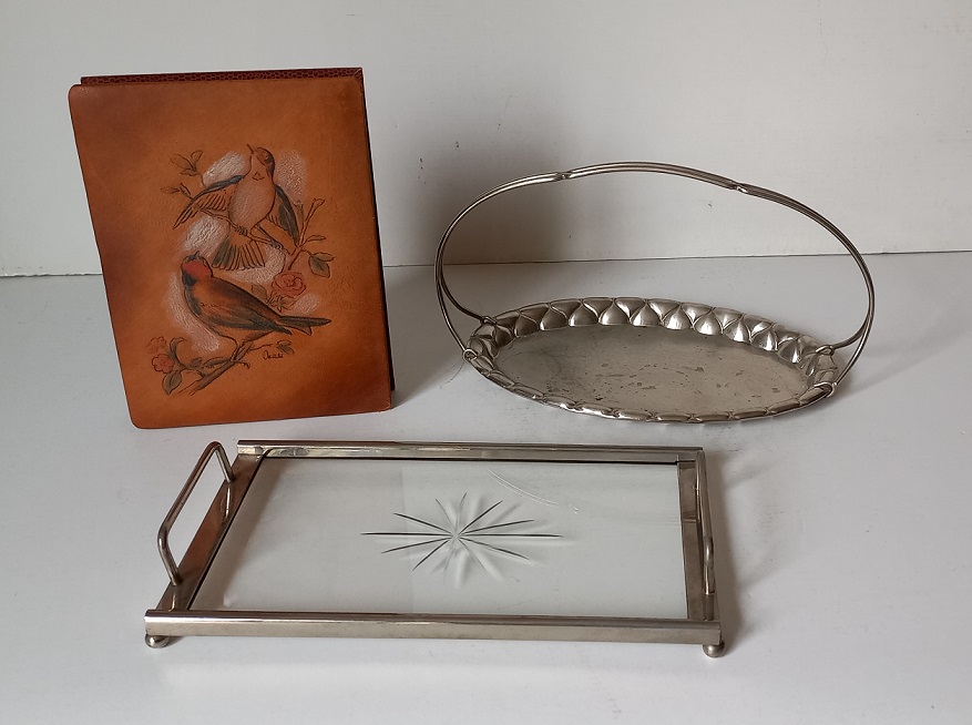 Lotto di un cestino ed un vassoio in metallo e cristallo ed una scatola rivestita in pelle decorata a volatili