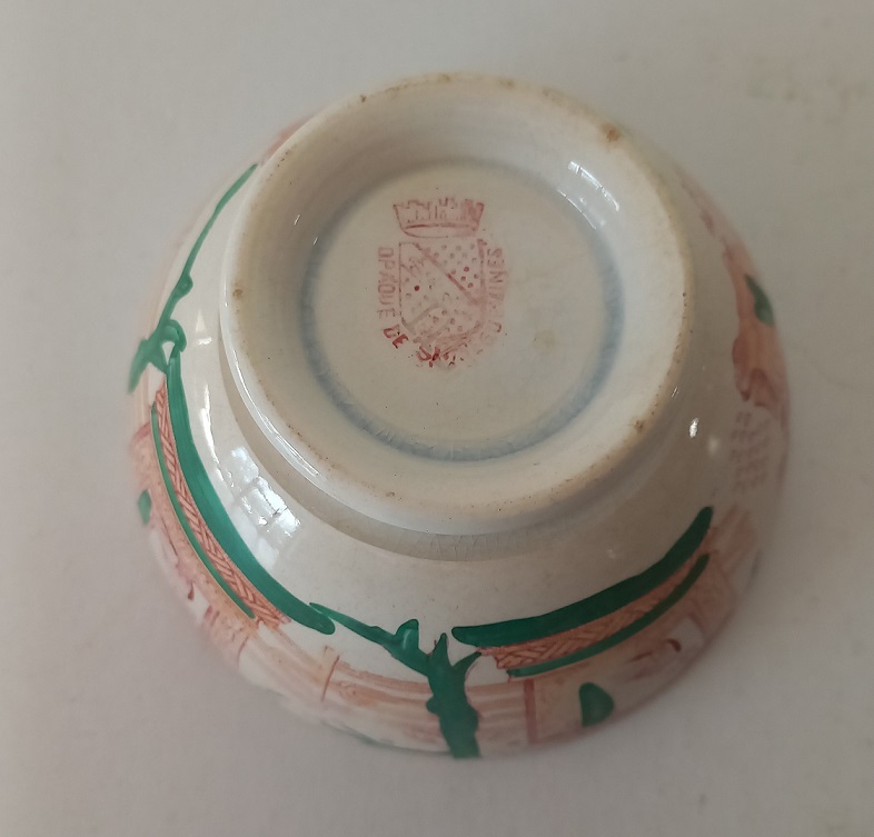 Coppetta antica in ceramica decorata a motivi orientali h.cm.6-manifattura Opaque de Sarreguemines con marchio e cifre incise nell'impasto-lievi felature