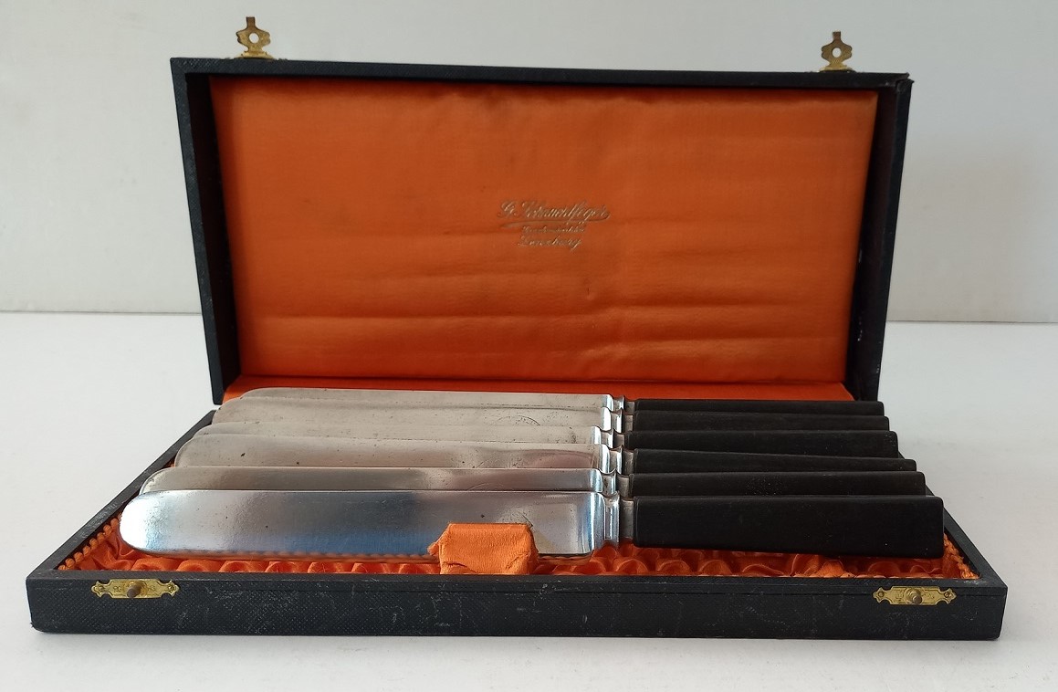 Set di sei coltelli punzonati con manico in ebano in scatola originale recante marchio G. Schwertfeger, Lenzburg