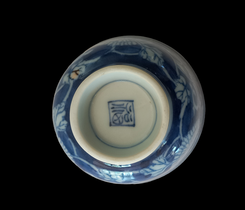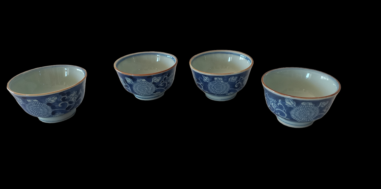 Quattro coppette in porcellana decorata in blu a motivi floreali h.cm.5 - manifattura orientale con marchi alla base