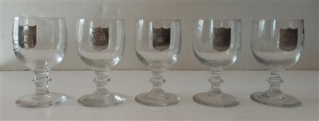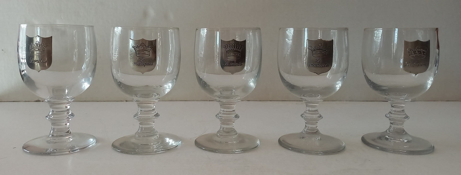 Cinque calici in vetro recanti stemmi in metallo a dicitura "Le duc, Le marquis, Le comte, Le vicomte, Le baron" coronati