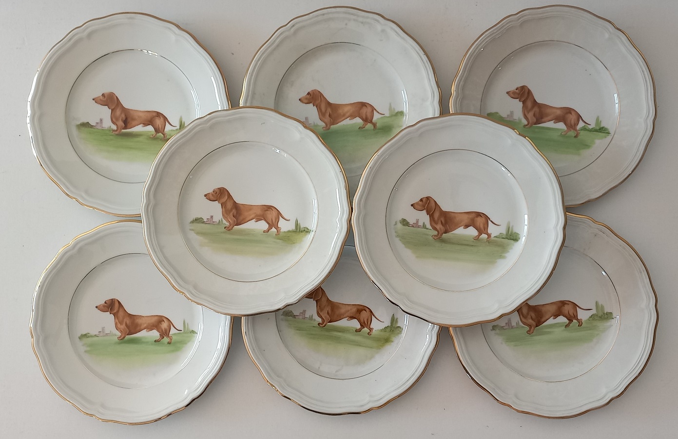 Otto piatti in porcellana Richard Ginori profilati in oro e decorati con cani bassotto dipinti a mano firmati Schubert al retro - diametro cm.24,5
