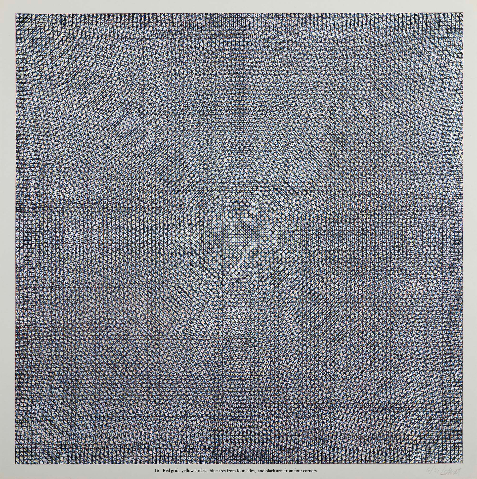 SOL LEWITT Red grid, yellow circles, blue arcs from four sides, and black arcs from four corners, 1972