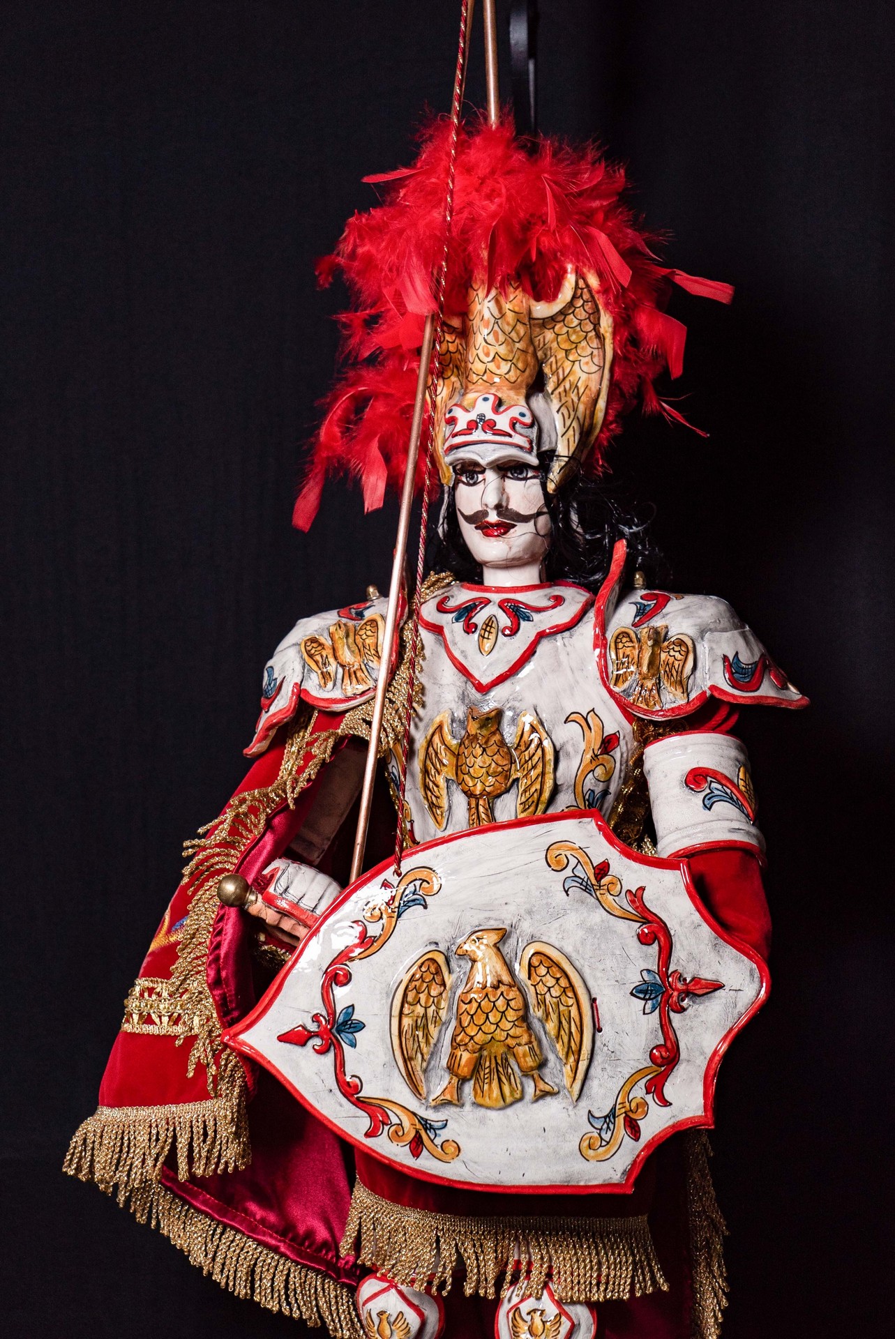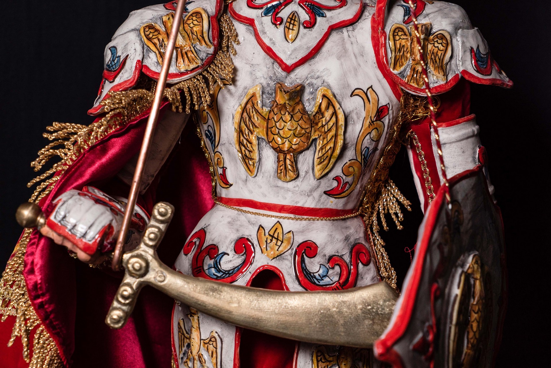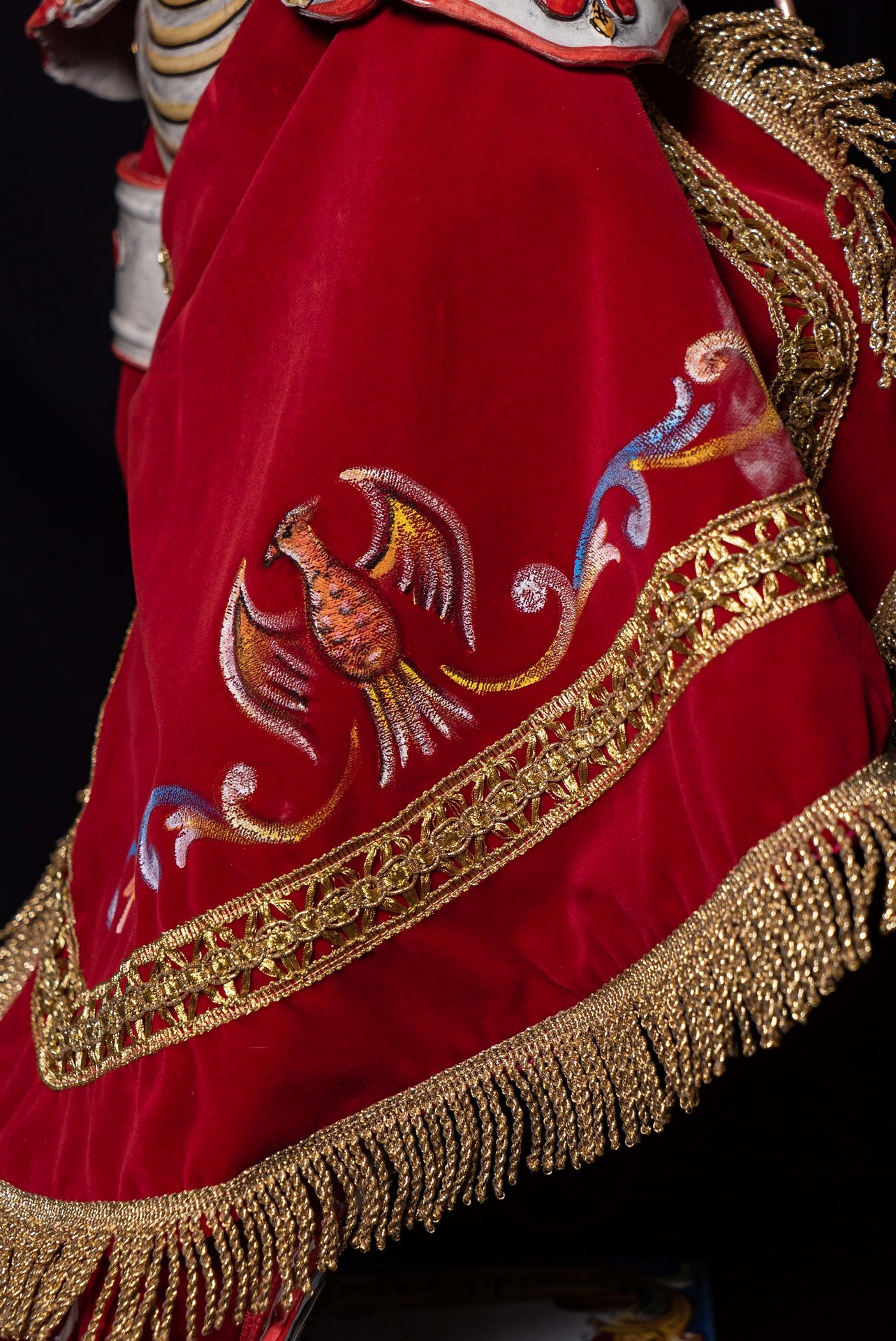 Autentico pupo siciliano realizzaro in Sicilia nel laboratorio artistico Patania. I quasi venti pezzi in ceramica che lo compongono seguono un rigoroso processo di lavorazione tramandato da tre generazioni dalla famiglia Patania. Lo "scheletro" è reallizzato in legno di faggio, le vesti in velluto adornato con frange di prima qualità e sfiziosamente decorato a mano sulla base. Compreso di staffa in ferro battuto e base in pietra lavica ceramizzata.