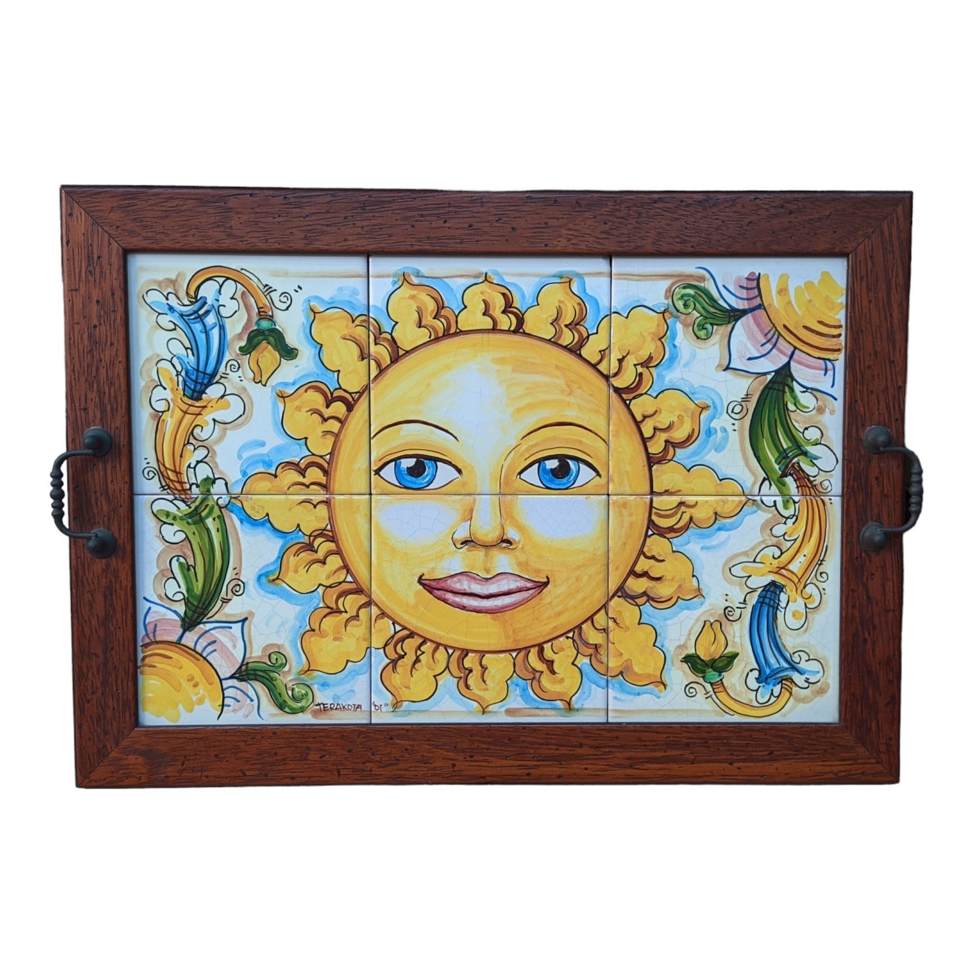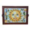 Vassoio in legno e superficie di appoggio in ceramica siciliana.