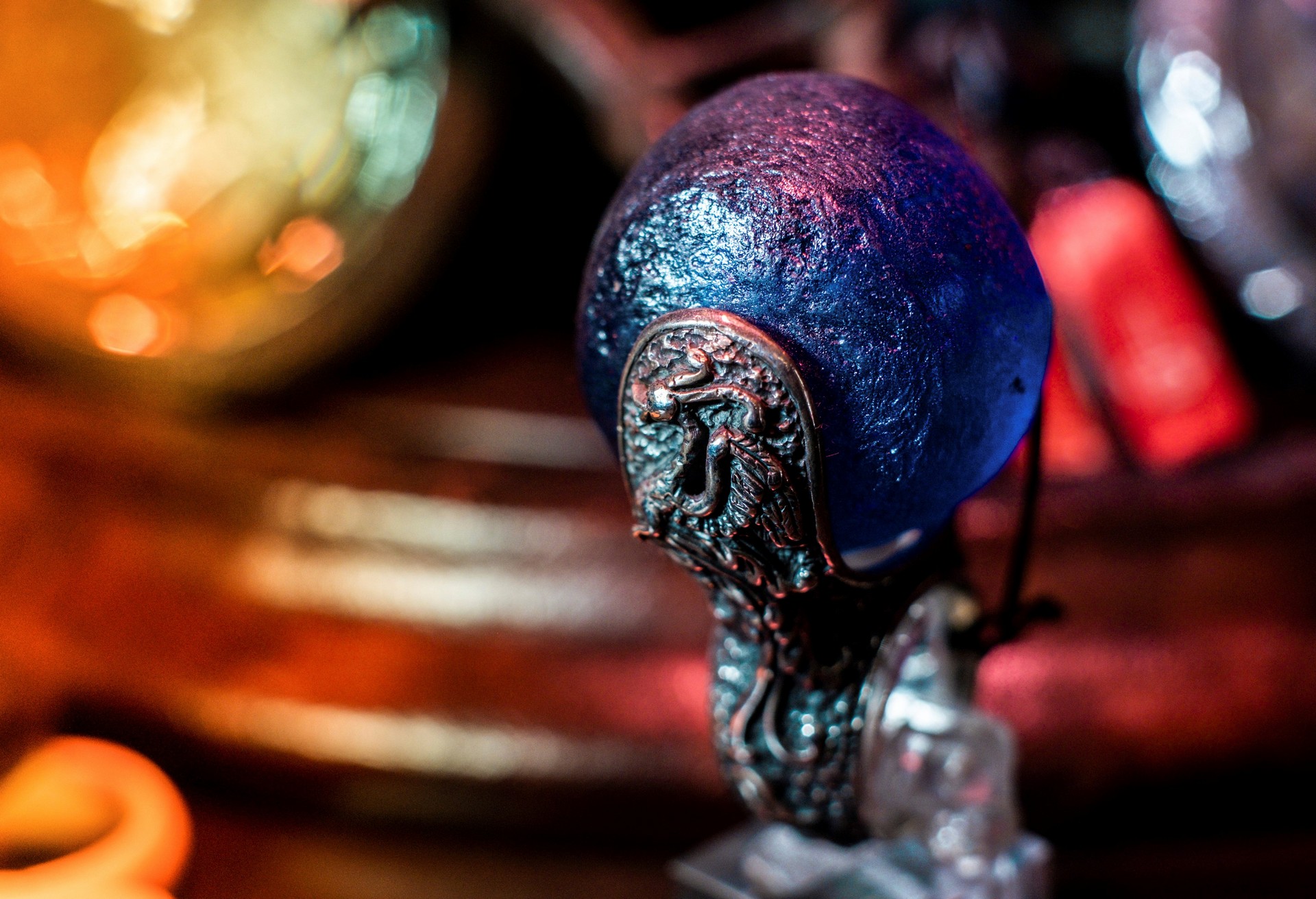 cera persa CGP-Cucinotta - Anello con elemento in pasta vitrea grezza cera persa In blu girevole, realizzato a cera persa con decoro grottesco in basso rilievo.