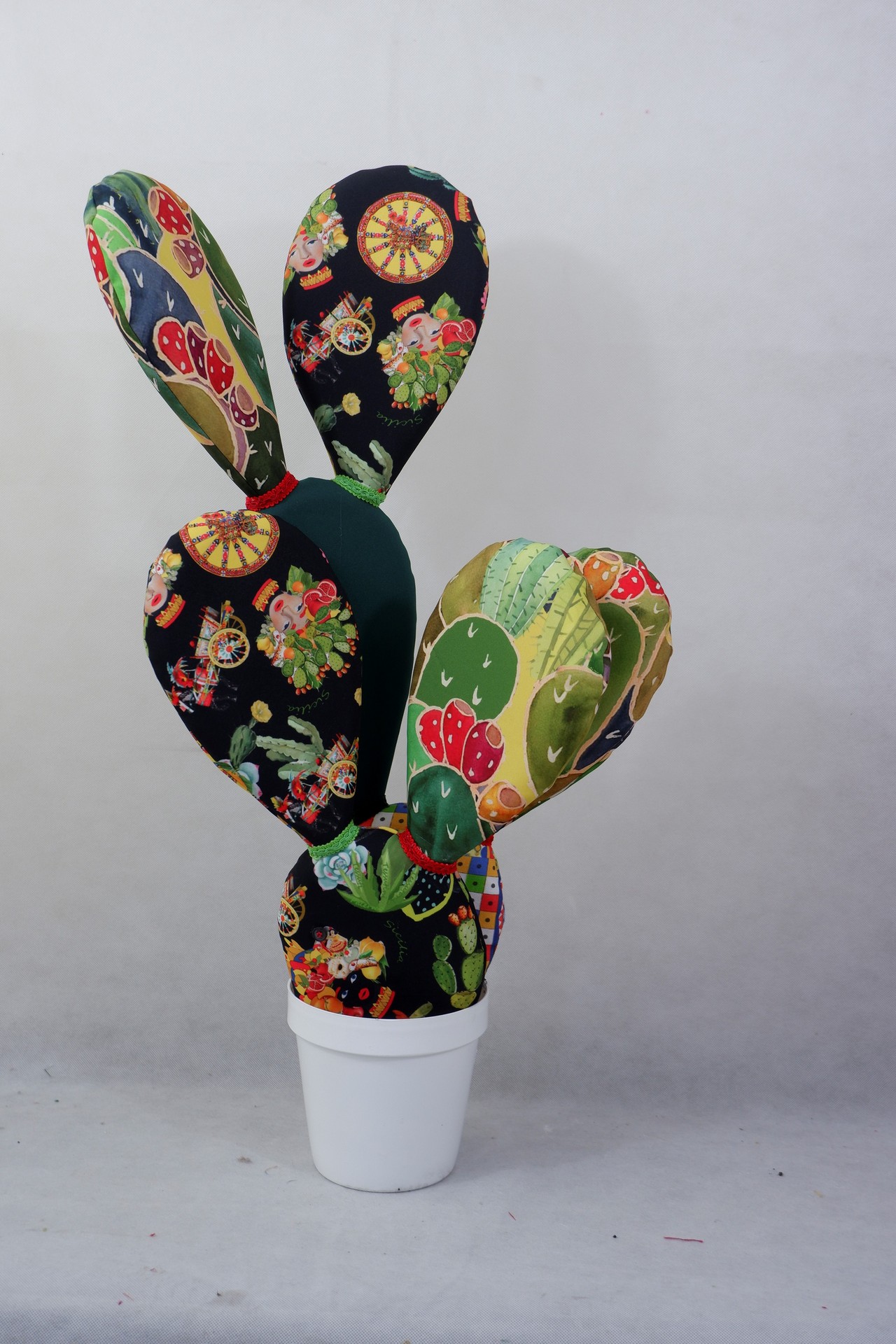 su 2 rami, tessuto esclusivo disegno e stampa digitale - fichi e mori Piante di Pezza di Elio Chiarenza - Piante di tessuto H cm 75xcm 40 su 2 rami, tessuto esclusivo disegno e stampa digitale - fichi e mori Tutto nasce da una passione eccentrica per il Fico d’India, capace di offrire un magico fondale scenico alla Sicilia. E’ a questa suggestione che si ispirano le stravaganti Piante di Pezza di Elio Chiarenza che, con estro, raffinatezza e ironia, seleziona e combina i tessuti ricercatissimi con i quali realizza ciascuna “Pala”. Le pale vengono preparate singolarmente, tagliate, cucite, riempite e poi lasciate una notte a prendere forma, prima di essere composte e abbinate fra loro. Il vaso bianco in cui sono poste è riempito con piccole e luccicanti pietre nere di pomice lavica dell’Etna ed è pensato per essere inserito in un cache pot che si adatti al proprio arredamento e che risalti il carattere della Pianta di Pezza. Il bottone, di madreperla per le più preziose, è cucito manualmente a firma di ciascuna opera. Le piante, completamente fatte a mano, sono dunque opere Uniche, dissimili tutte tra di loro ma tutte icone di una sicilianità nuova, fatta di ironia, memoria e contaminazione.
