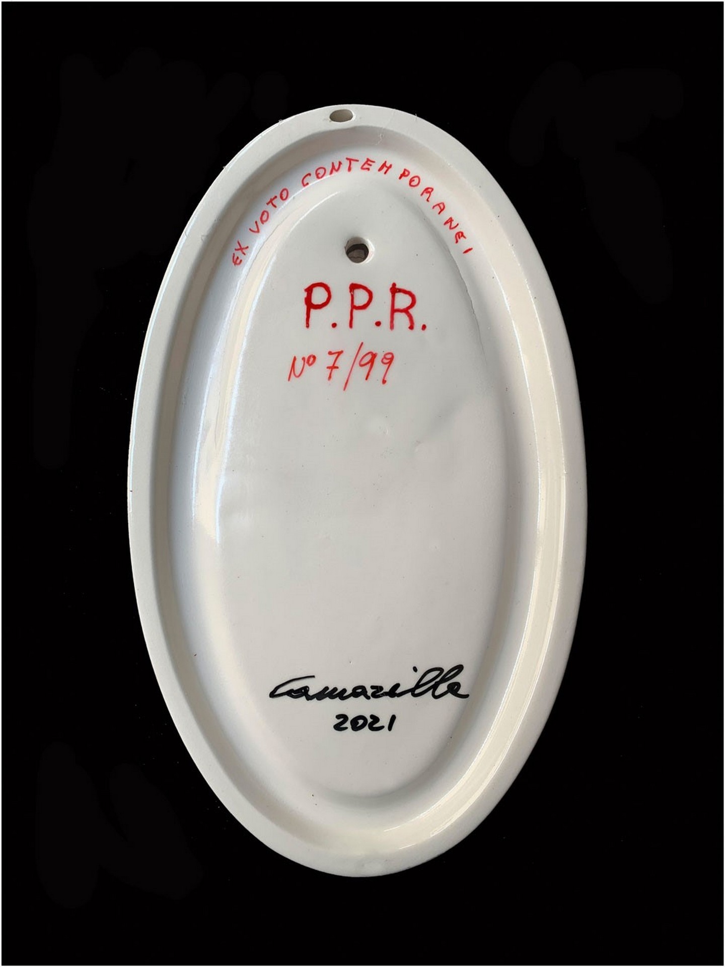 “Ex Voto contemporanei” sono opere ovali di ceramica bianca nel cui centro è impresso il palmo di una mano, pronta a “ricevere“. In quell’incavo viene poi posizionato un simbolo tridimensionale che rappresenta la moderna Grazia. Nella tradizione della devozione popolare cattolica, gli ex-voto testimoniano la gratitudine dei fedeli per un intervento divino salvifico: guarigioni e scampati pericoli di natura materiale.Questi Ex Voto d’autore propongono una concezione immateriale della Grazia Ricevuta: Per Talento Ricevuto, Per Sorte Ricevuta, Per Passione Ricevuta… sono alcuni esempi di una rivisitazione che nasce con l’intento di far transitare, dalla tradizione all’attualità, l’estetica di un’iconografia votiva e i suoi contenuti.Le “Mani Yoga“ sono gli ultimi esiti di una vocazione tesa a scandagliare tra le diverse fonti della Spiritualità e del Sacro. Le Mani Yoga presentano anche un piccolo foro per essere usate come Porta IncensoLe stesse parole dell’autore, in un’intervista, chiariscono come sono nate.“Un giorno maneggio una di quelle Mani, candida, di terra cotta smaltata, luminosa, intatta. Me la guardo come se quel palmo aperto fosse il campo in cui rappresentare il personale bisogno di equilibrio interiore e di Armonia con l’Universo che da qualche tempo mi portano al di là del mio interesse per il Mediterraneo, ad Oriente, all’universo dello Yoga, al senso della sua pratica, ai suoi simboli potenti. Mosso da quella suggestione intima, ho dipinto dentro il palmo di quella mano. Con tecnica di punti e linee ho tratteggiato la scena di mani giunte, Sillaba Madre, Chakra, decori, come fossero rilasciati lì da Hennè di un’India colorata. Mano OM, l’ho battezzata così, in omaggio alla vibrazione che connette l’universo interiore a quello cosmico. Occhio Spirituale e Loto della Purezza sono nati successivamente, come naturale conseguenza, per essere rappresentati in altre Mani.Grazie alla creta di Nostra madre Terra.