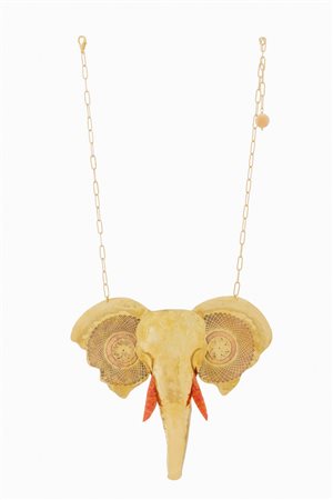 Realizzata interamente a mano con tecniche tradizionali di cesellatura, incisione e imbossatura NicoDesign® - Collana Elefante 15 cm + catena Realizzata interamente a mano con tecniche tradizionali di cesellatura, incisione e imbossatura Collana artigianale in ottone a forma di elefante decorata con corallo rosso e catena in ottone.