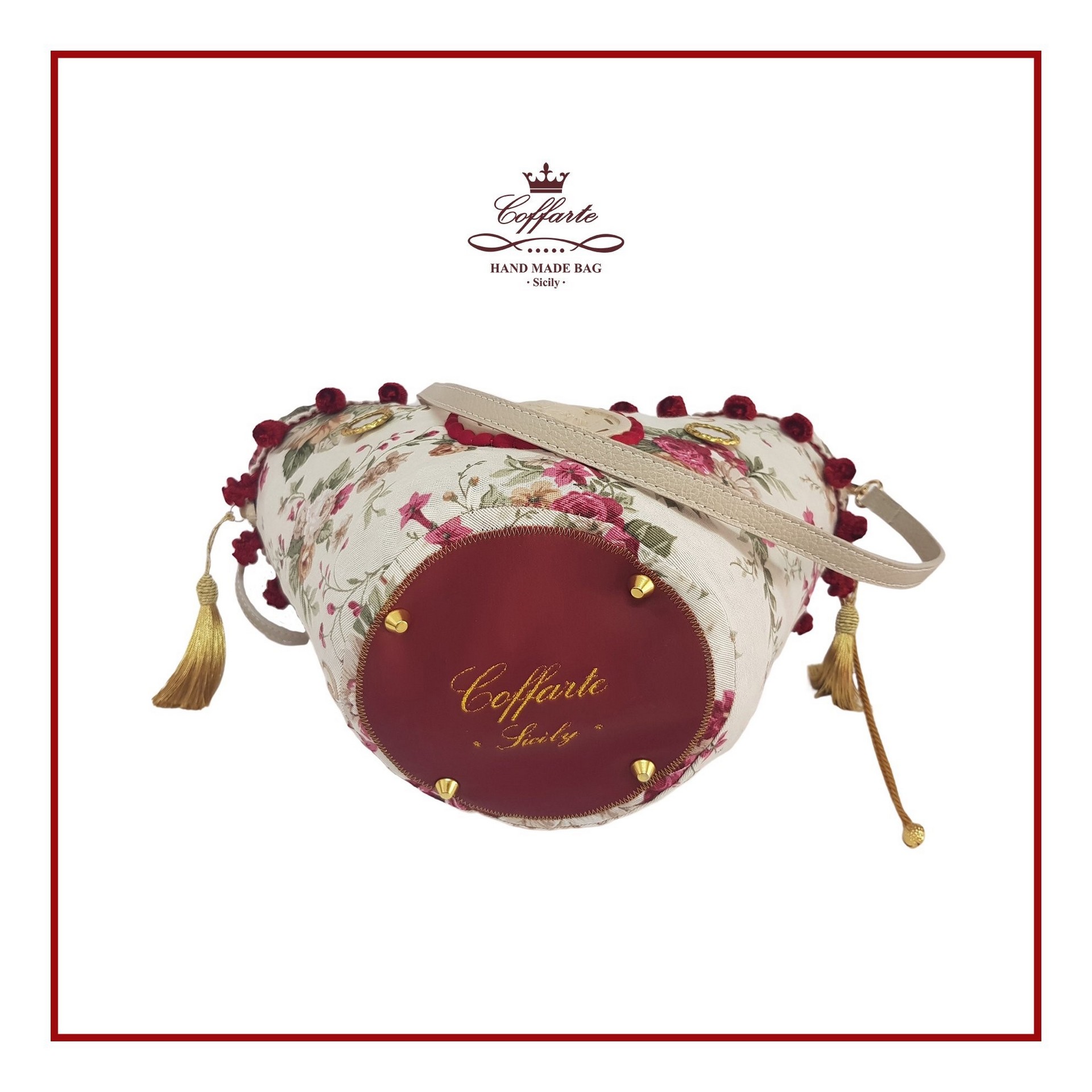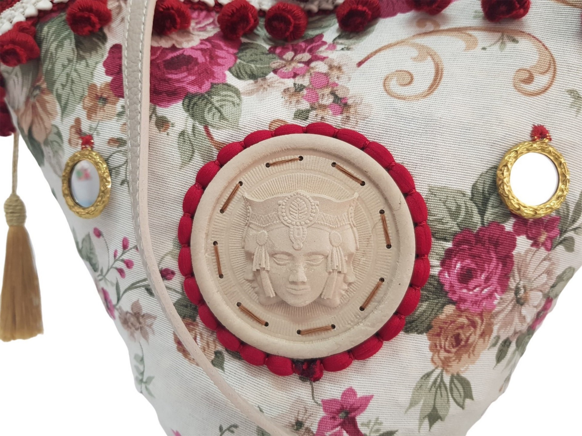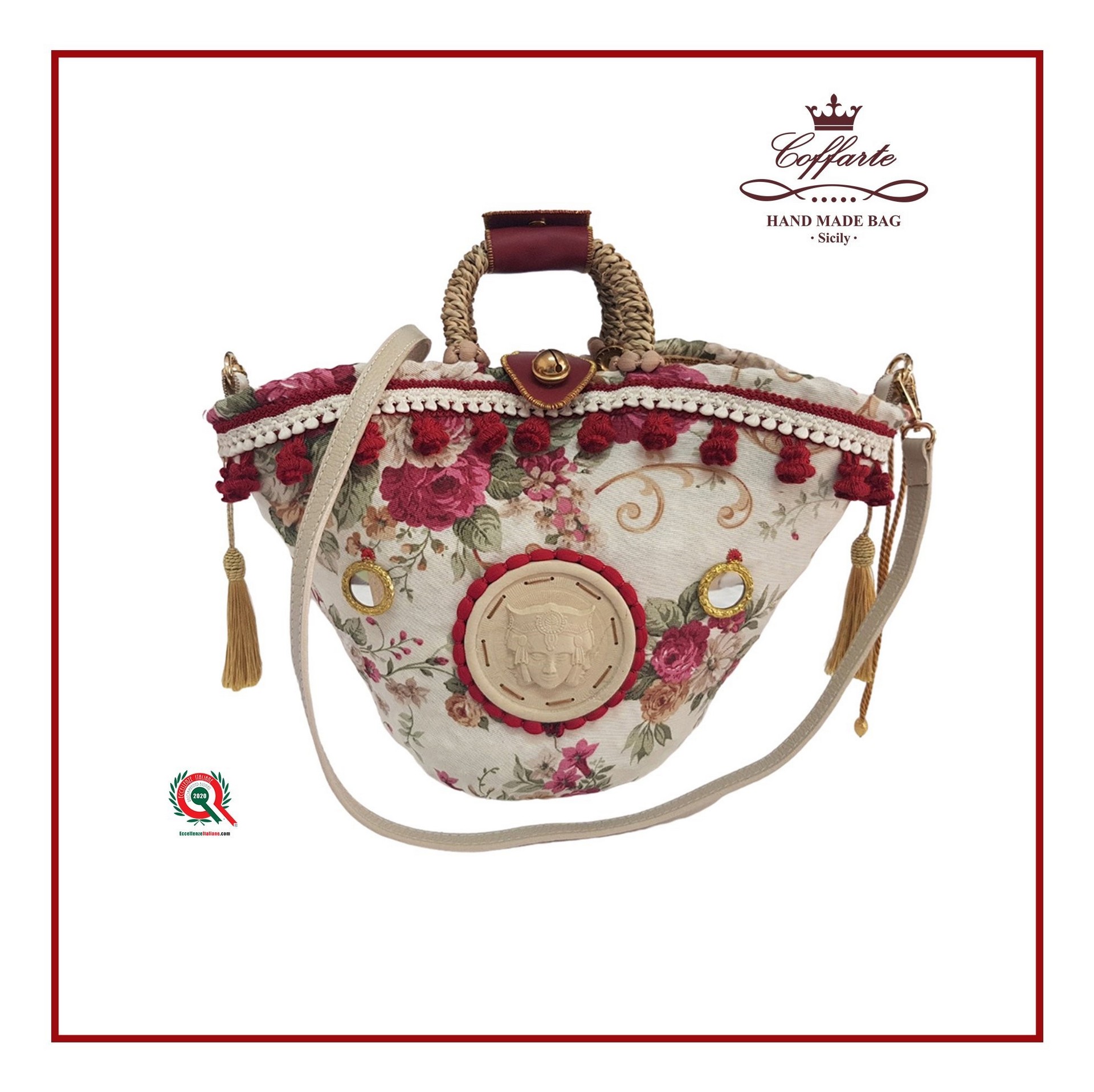 cotone Coffarte Sicily - Coffa dionisio cm 40x25, escluso manici; kg 0,800 cotone Rivestimento in cotone stampato con fantasia rose, fashion e di tendenza con inserto centrale in pietra inciso, specchietti in pietra e passamanerie tipiche siciliane cuciti interamente a mano, marchietto coffarte su lato posteriore e teste di leoni laterale con nappine. Utilizzo multiuso, a manico e tracolla regolabile e rimovibile. Chiusura a campana e a sacco inserti di pizzo.