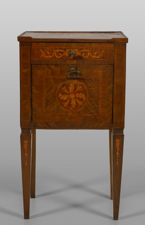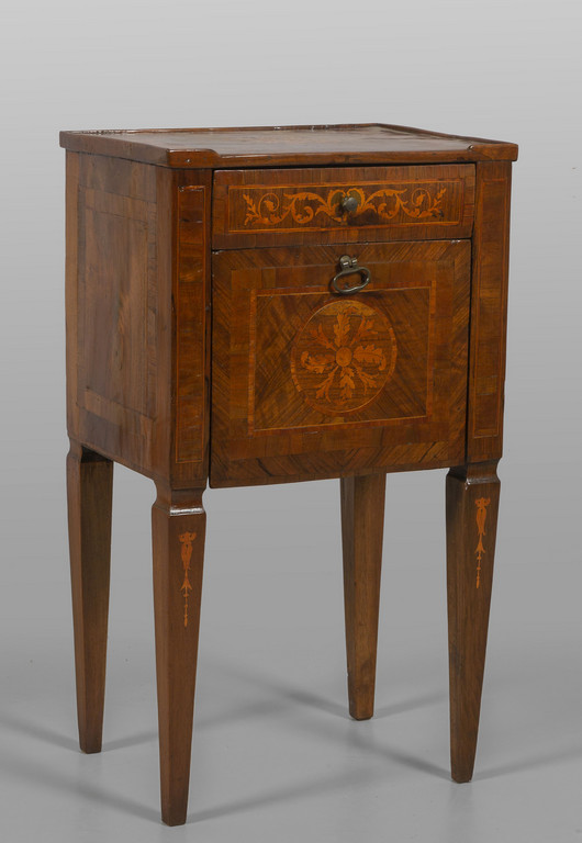 Comodino Luigi XVI lastronato ed intarsiato in legni vari, sul fronte sportello ad antina con cassetto sottopiano, Lombardia II metà sec.XVIII