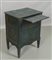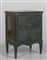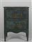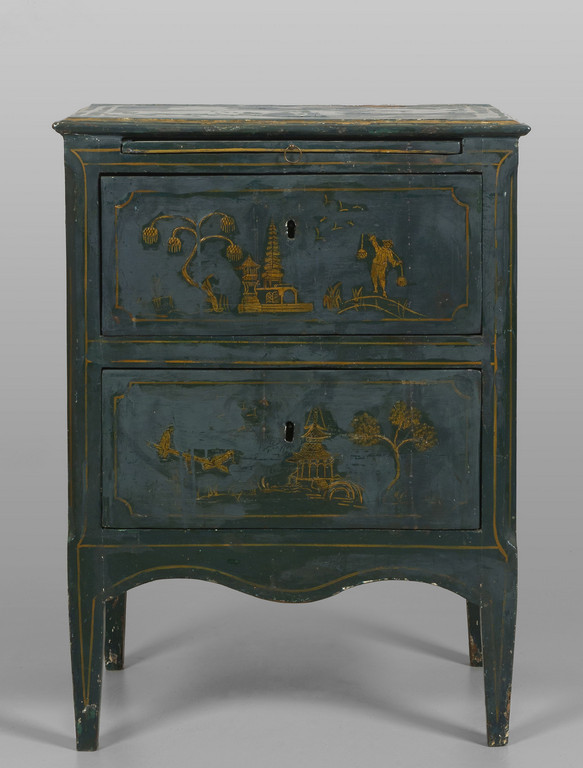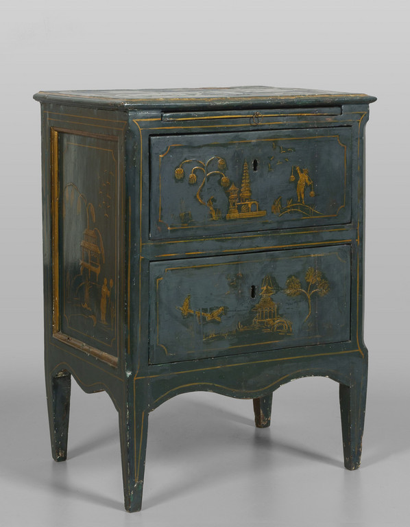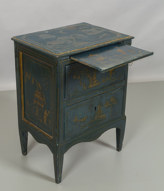 Comodino a due cassetti più tiretto laccato a fondo blu con paesaggi dorati di gusto cinese, sec.XIX