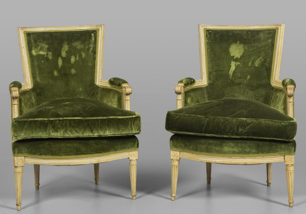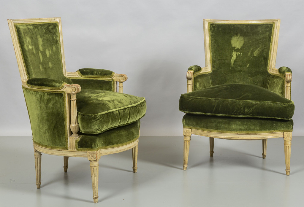 Coppia di bergeres in legno laccato in velluto verde, Francia sec.XIX