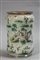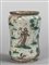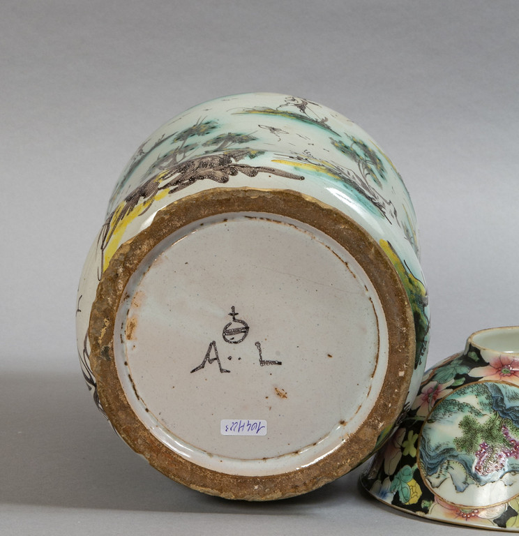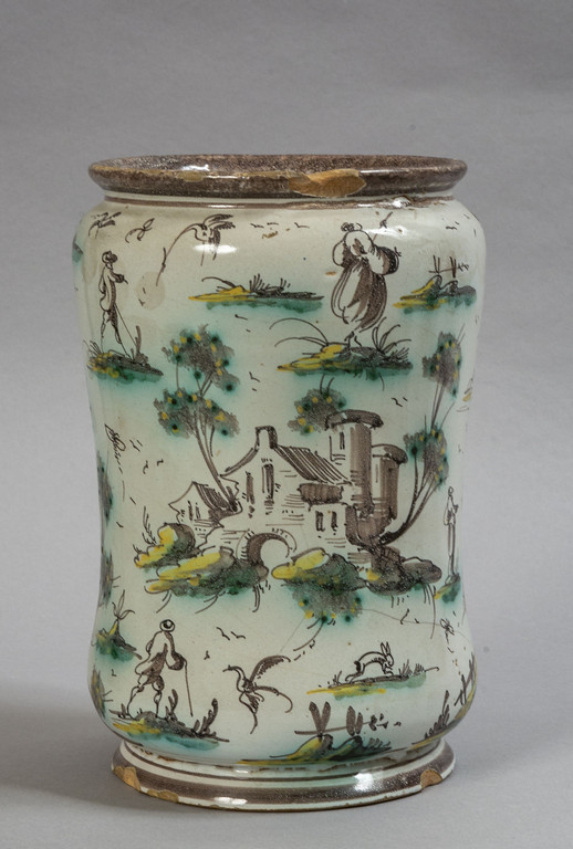 Albarello in ceramica decorato in policromia con personaggi, marca AL con globo, Savona fine sec.XIX