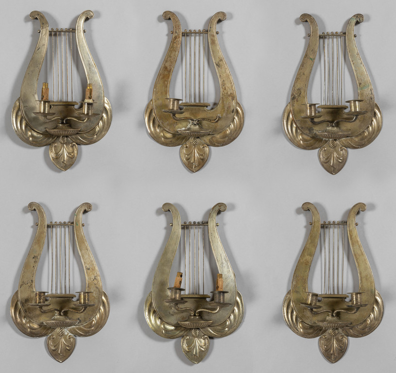 Sei apliques in rame argentato a forma di lira f.te L. Sfriso (una senza braccetti)