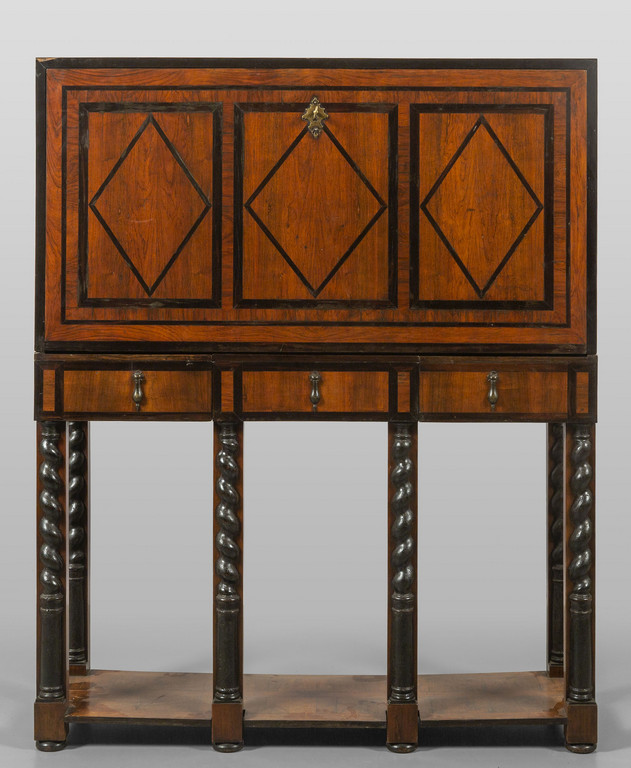 Monetiere Luigi XIV lastronato in palissandro ed ebano, all'interno diciotto cassettini e sportello a tabernacolo, Germania sec.XVIII