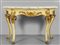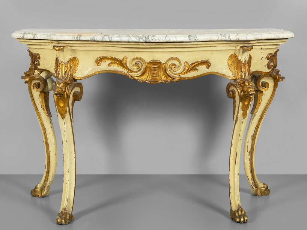 Console Luigi XIV a quattro gambe in legno intagliato, laccato e dorato, capitelli a forma di draghi marini, piano in marmo, Italia Centrale sec.XVIII