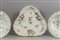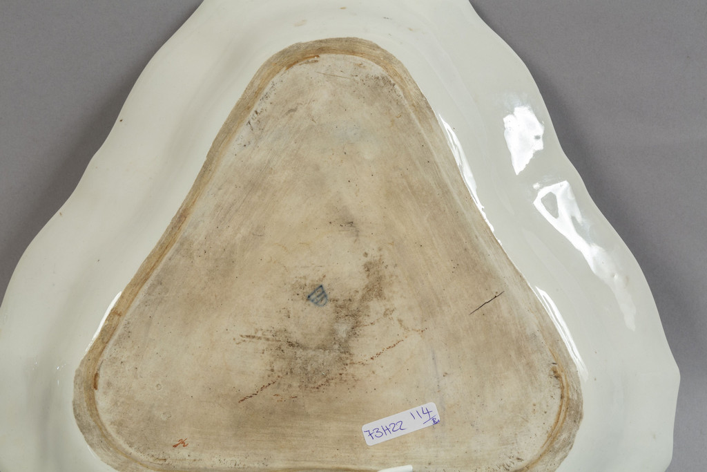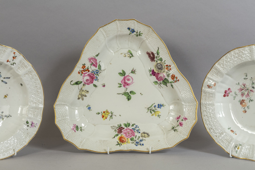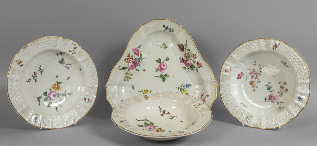 Tre piatti fondi ed un vassoio triangolare in porcellana bianca decorati in policromia, Vienna sec.XIX
