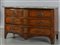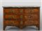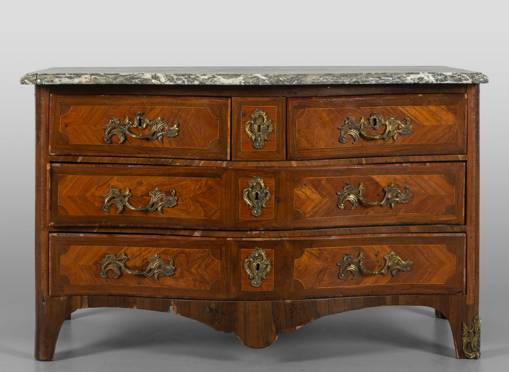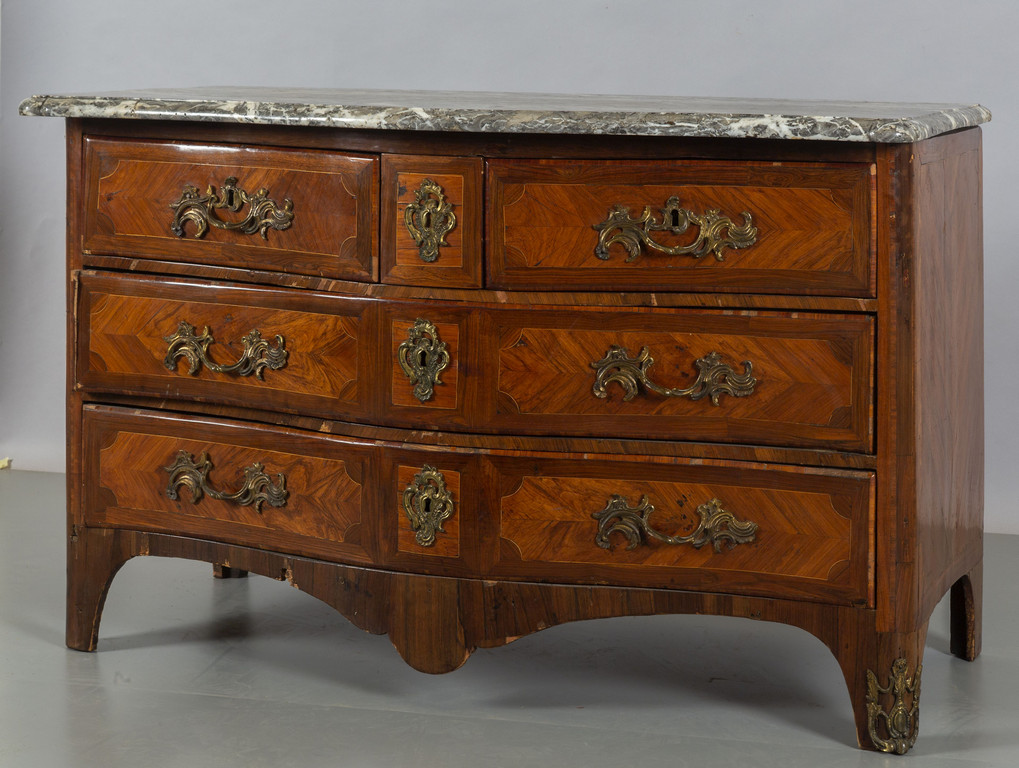 Comò Luigi XV a due cassetti grandi e tre piccoli, lastronati in palissandro e bois de rose, piano in marmo, Francia sec.XVIII
