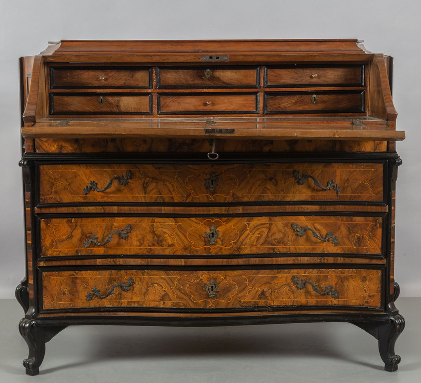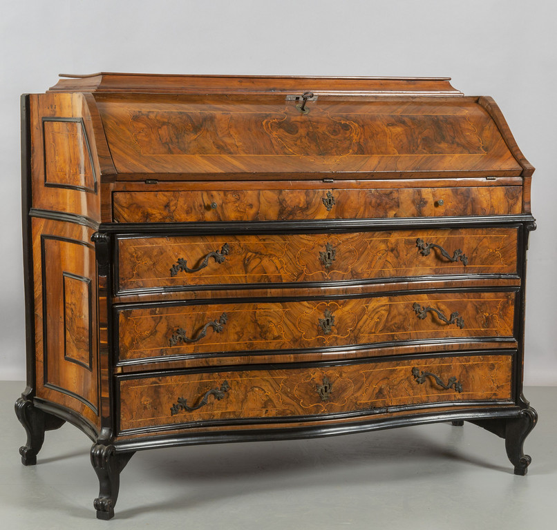 Ribalta Luigi XIV lastronata in noce e radica di noce, con cornici ebanizzate, mossa sul fronte e sui fianchi, montanti scantonati, Lombardia I metà sec.XVIII