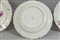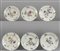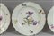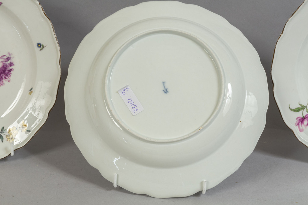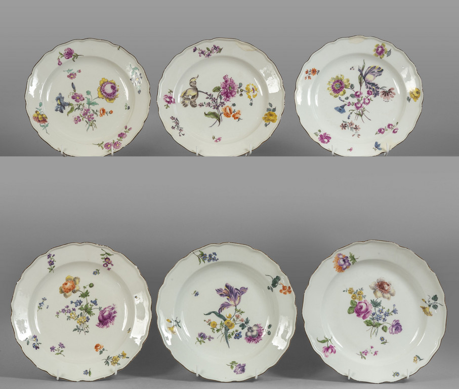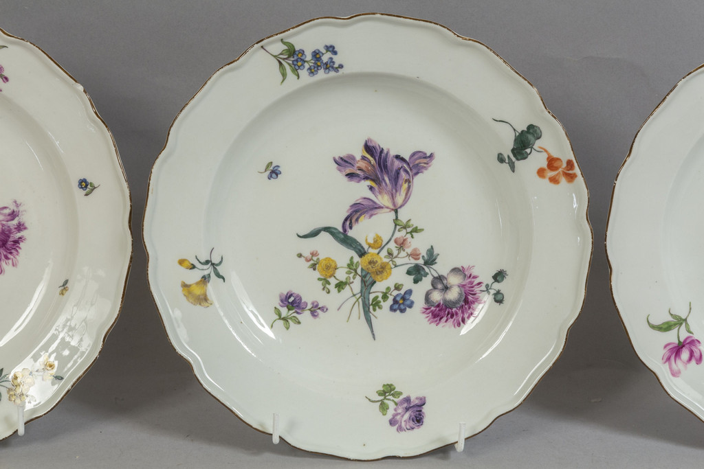Sei piatti in porcellana di Meissen decorati in policromia a fiori su fondo bianco, bordo marrone