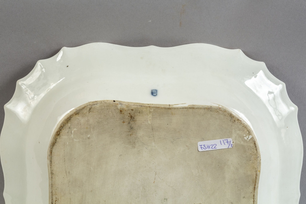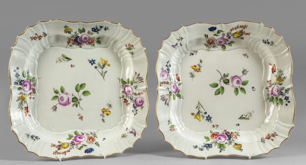Coppia di risottiere di forma quadrata di porcellana bianca decorata in policromia a fiori, sec.XVIII